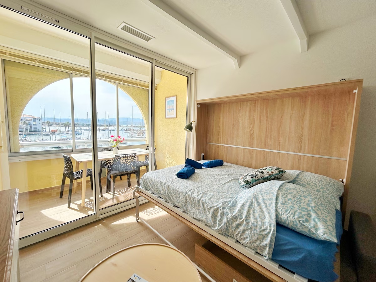 ⬆️ 1 chambre avec un lit 160 x 200, literie de bonne qualité pour un maximum de confort et baie vitrée donnant sur petite loggia avec vue sur le port 🌅🌊